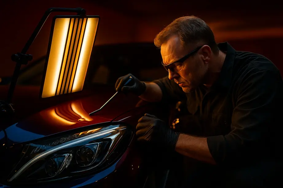 Our expert technicians specialize in Paintless Dent Repair (PDR), a precise method to remove dents, dings, and hail damage without affecting your vehicle’s original finish. Using specialized tools and lighting, we restore your panels back to perfect—quickly and affordably.